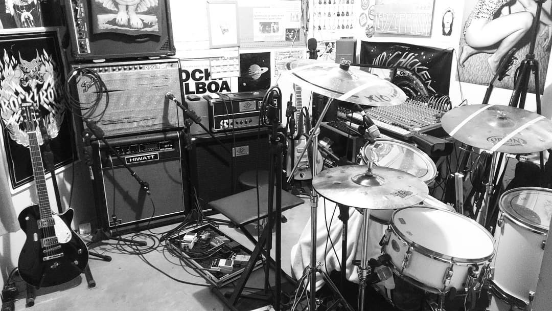 "Desde que comecei à tocar em bandas, era normal que os ensaios acontecessem na minha casa, seja na garagem ou no meu próprio quarto. Essa sala onde funciona o estúdio hoje se fixou como local de ensaio das minhas bandas em