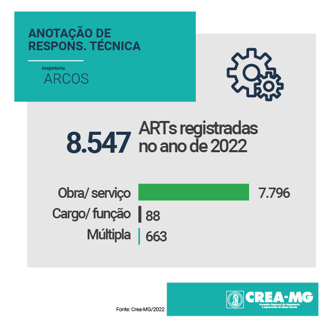 Em 2022, o Conselho Regional de Engenharia e Agronomia de Minas Gerais (Crea-MG) realizou 59.858 ações de fiscalização em todo o estado, aumento de 14,7% em relação a 2021. As ações resultaram em 28.562 autos de infração. A ausência de registro das empresas, faltas de Anotação de Responsabilidade Técnica (ART) e de profissional legalmente habilitado foram as principais irregularidades encontradas. Na inspetoria de Arcos, foram realizadas 910 ações, com a identificação de 273 irregularidades. “A nossa atividade principal é combater o exercício ilegal das atividades técnicas, que coloca pessoas e patrimônio em risco”, destaca o presidente do Crea-MG, engenheiro civil Lucio Fernando Borges.