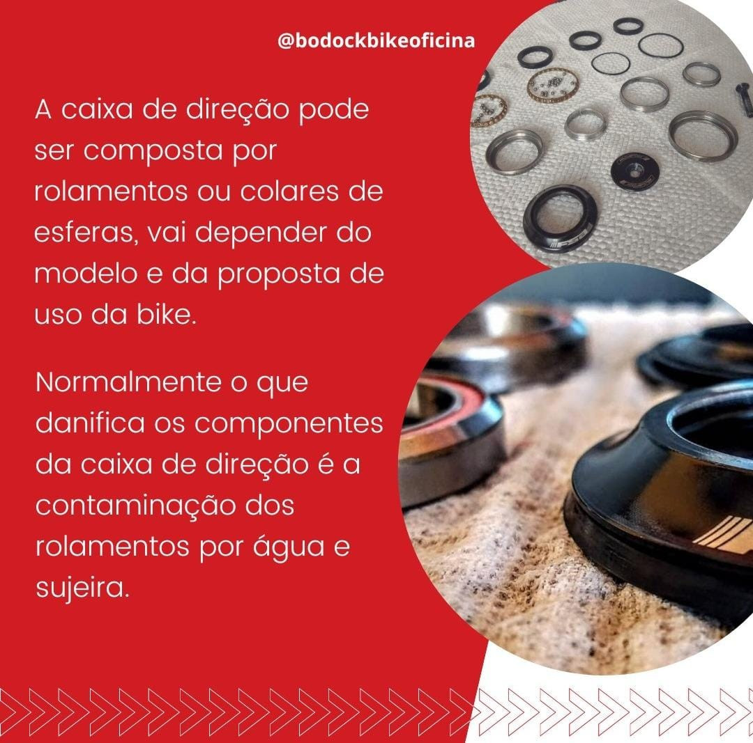 A caixa de direção pode ser composta por rolamentos ou colares de esferas, vai depender do modelo e da proposta de uso da bike. Normalmente o que danifica os componentes da caixa de direção é a contaminação dos rolamentos por água e sujeira.