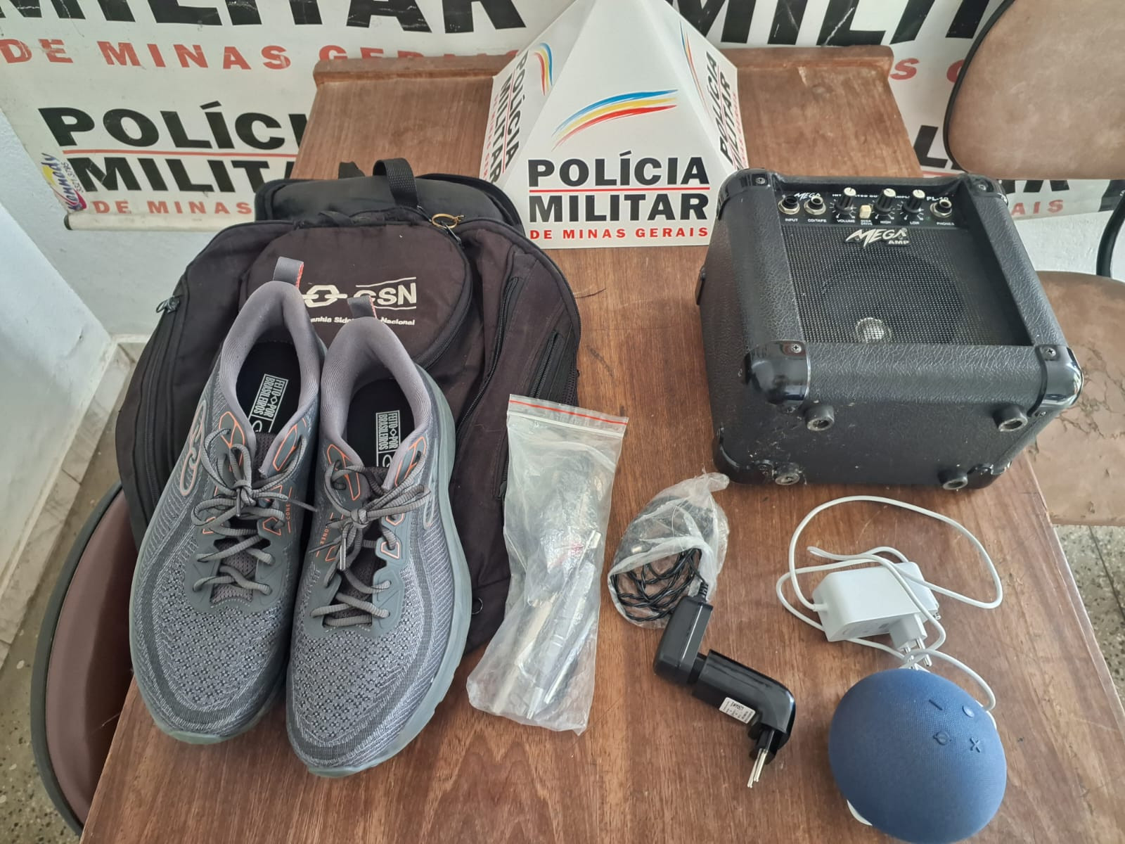 A vítima relatou que o autor arrombou a janela de um dos quartos para acessar a residência, subtraindo uma caixa de som Alexa azul com carregador branco, uma caixa de som da marca Mega preta, um par de tênis da marca Olympikus cinza, uma mochila preta, um jogo de conexões e um carregador preto, evadindo em seguida.