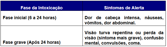 "A intoxicação por metanol é uma emergência médica grave. A ingestão pode causar cegueira e até levar à morte em poucas horas." – Organização Mundial da Saúde (OMS). A dose letal é de apenas 1 a 2 mL/kg em adultos.