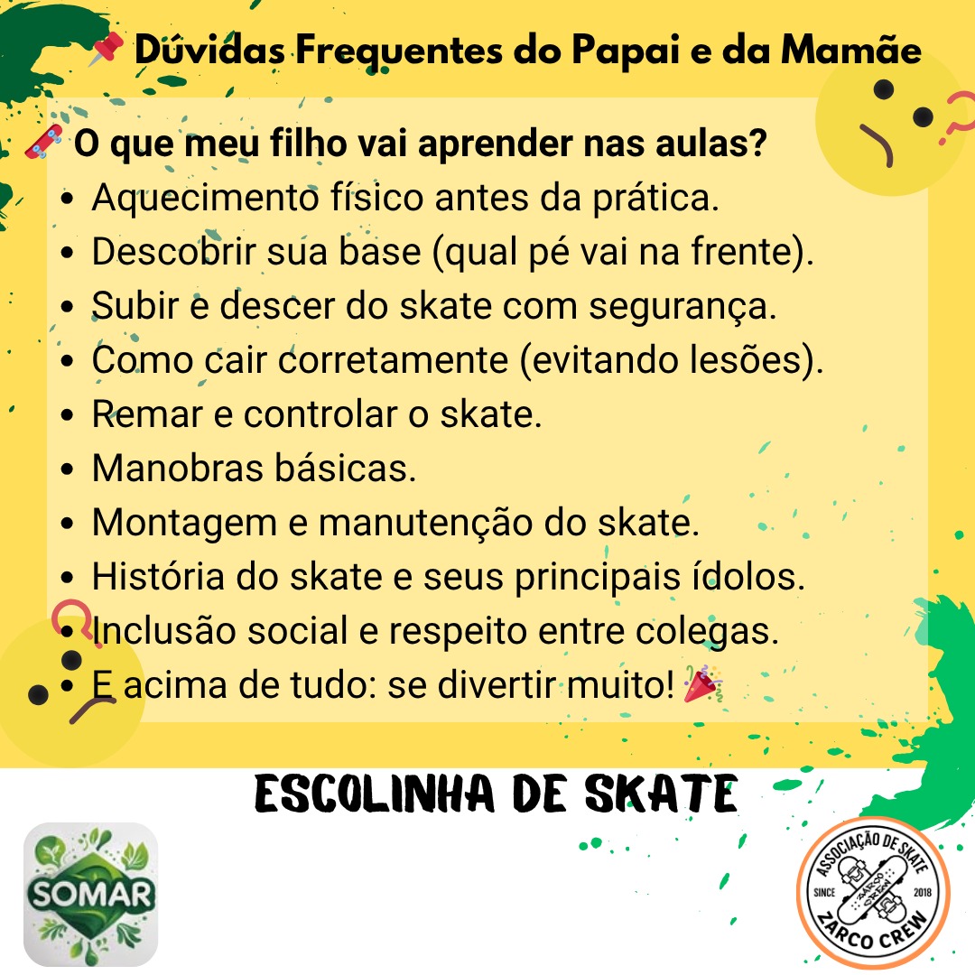 Os encontros da Escolinha de Skate acontecerão todas as quartas-feiras, no período da manhã, das 9h às 10h30, a partir do dia 22 de outubro. Não é obrigatório que a criança tenha o próprio skate, mas se já tiver, ele é bem-vindo!