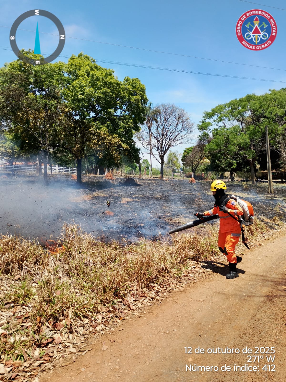 No local, as chamas se espalharam por uma linha de aproximadamente 100 metros de extensão, atingindo uma área de pastagem. O fogo apresentava características de queima superficial e se deslocava rapidamente devido às condições de vento.
