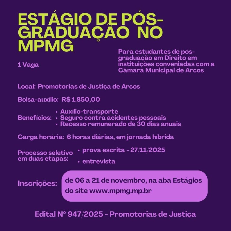 * Edital Nº 947/2025: uma vaga para estudantes de pós-graduação em Direito em instituições conveniadas com a Câmara Municipal de Arcos, que tenham concluído a graduação na área e com previsão de estágio no projeto pedagógico do curso em andamento.