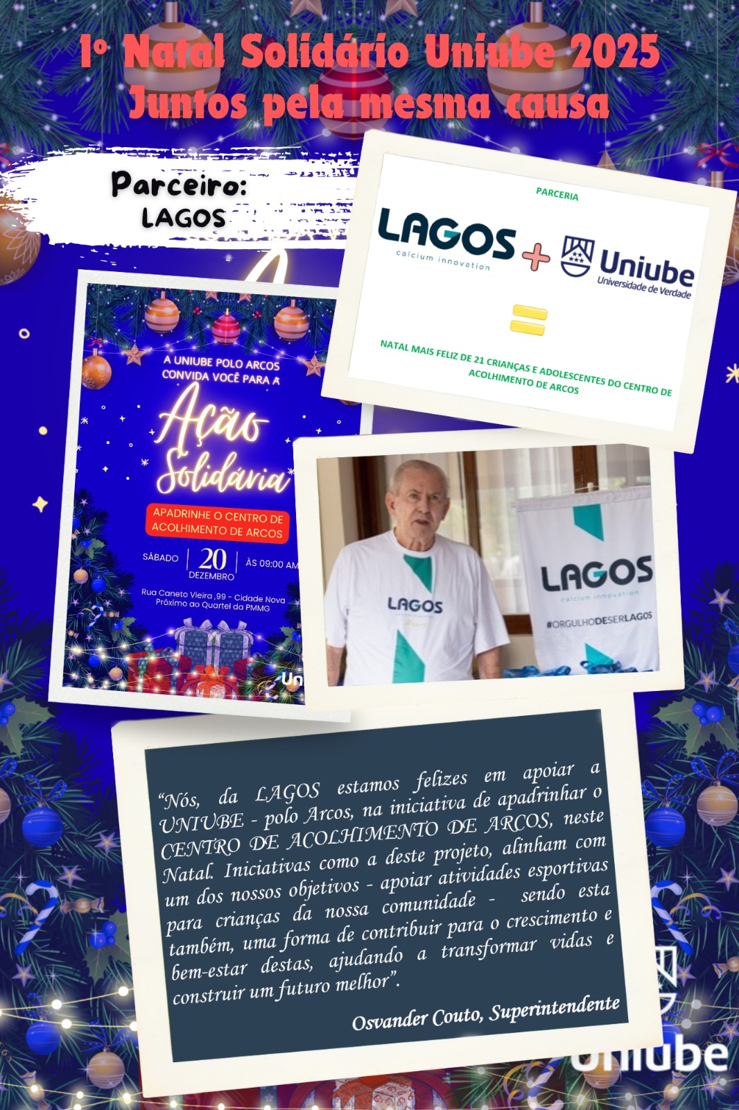 Nós, da LAGOS estamos felizes em apoiar a UNIUBE - polo Arcos, na iniciativa de apadrinhar o CENTRO DE ACOLHIMENTO DE ARCOS, neste Natal. Iniciativas como a deste projeto, alinham com um dos nossos objetivos - apoiar atividades esportivas para crianças da nossa comunidade - sendo essa também, uma forma de contribuir para o crescimento e bem-estar destas, ajudando a transformar vidas e construir um futuro melhor”, destaca Osvander Couto, Superintendente da Lagos.