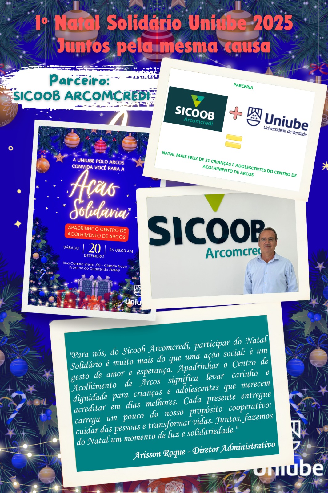 "Para nós, do Sicoob Arcomcredi, participar do Natal Solidário é muito mais do que uma ação social: é um gesto de amor e esperança. Apadrinhar o Centro de Acolhimento de Arcos significa levar carinho e dignidade para crianças e adolescentes que merecem acreditar em dias melhores. Cada presente entregue carrega um pouco do nosso propósito cooperativo: cuidar das pessoas e transformar vidas. Juntos, fazemos do Natal um momento de luz e solidariedade." destaca Arisson Roque - Diretor Administrativo do Sicoob Arcomcredi.