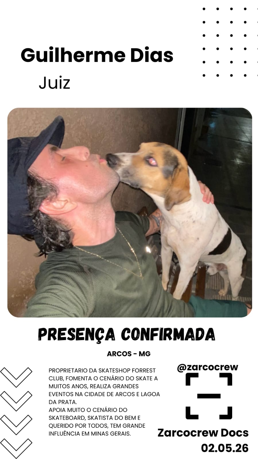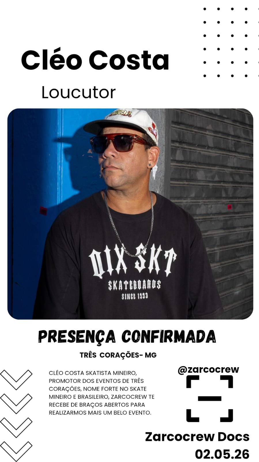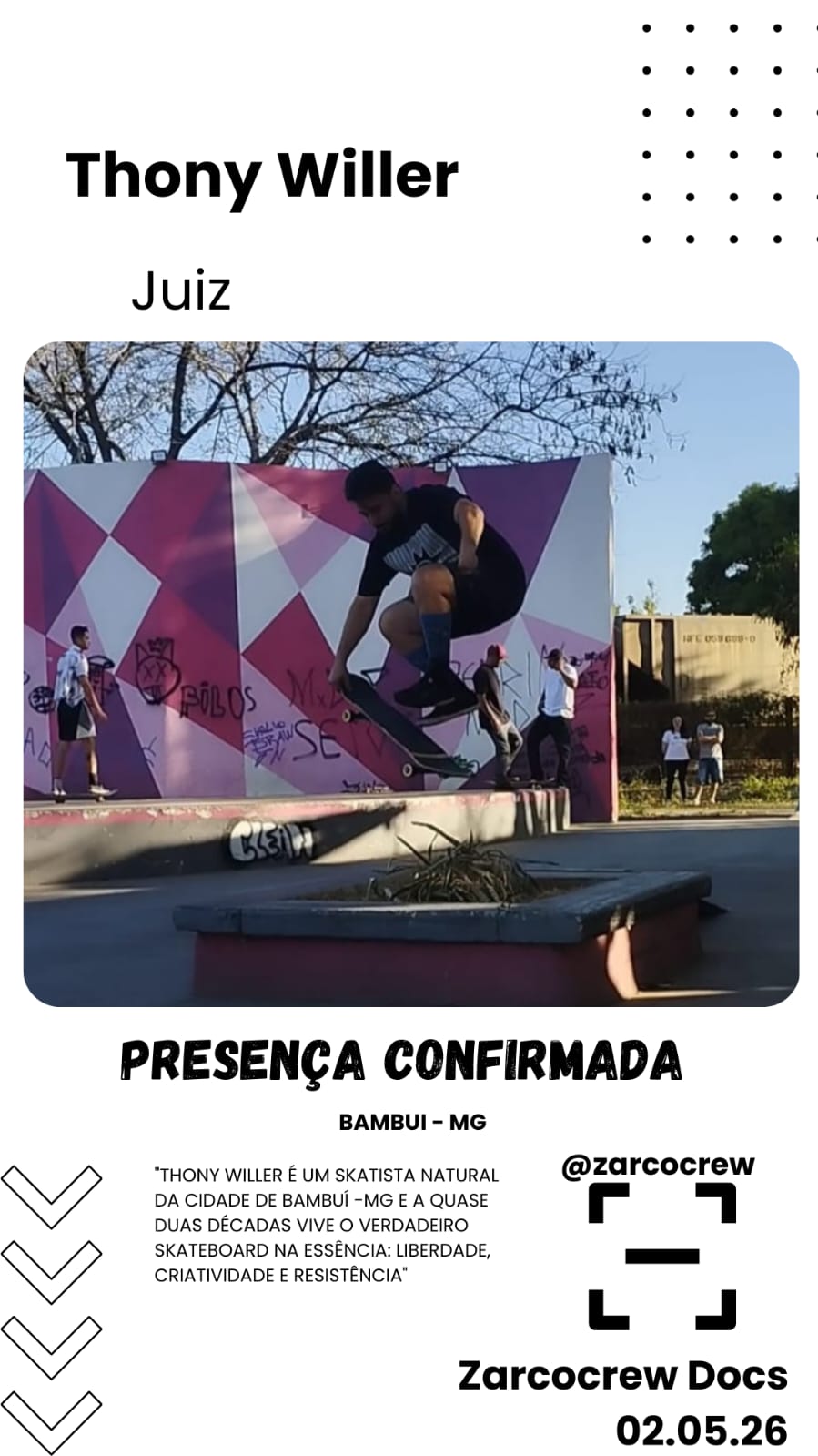 O skate em Arcos está prestes a realizar sua manobra mais complexa e estratégica até aqui, e ela não acontece sobre o shape, mas no papel. Nos dias 02 e 03 de maio, a pista pública da cidade sedia o "Zarcocrew Docs", evento que marca a transição da tradicional associação de skatistas para uma entidade jurídica formalizada.