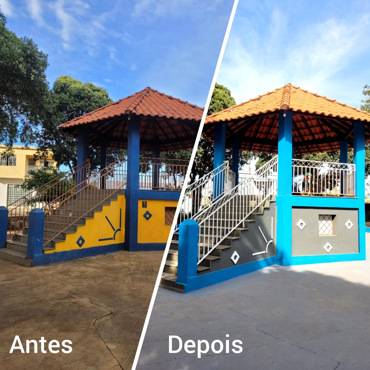 A intervenção contemplou uma série de melhorias, incluindo pintura geral, recuperação de bancos, reconstrução de rampas de acessibilidade, além de serviços de poda e limpeza. Também foi realizada a troca do piso do coreto e a pintura de toda a parte externa da praça.
