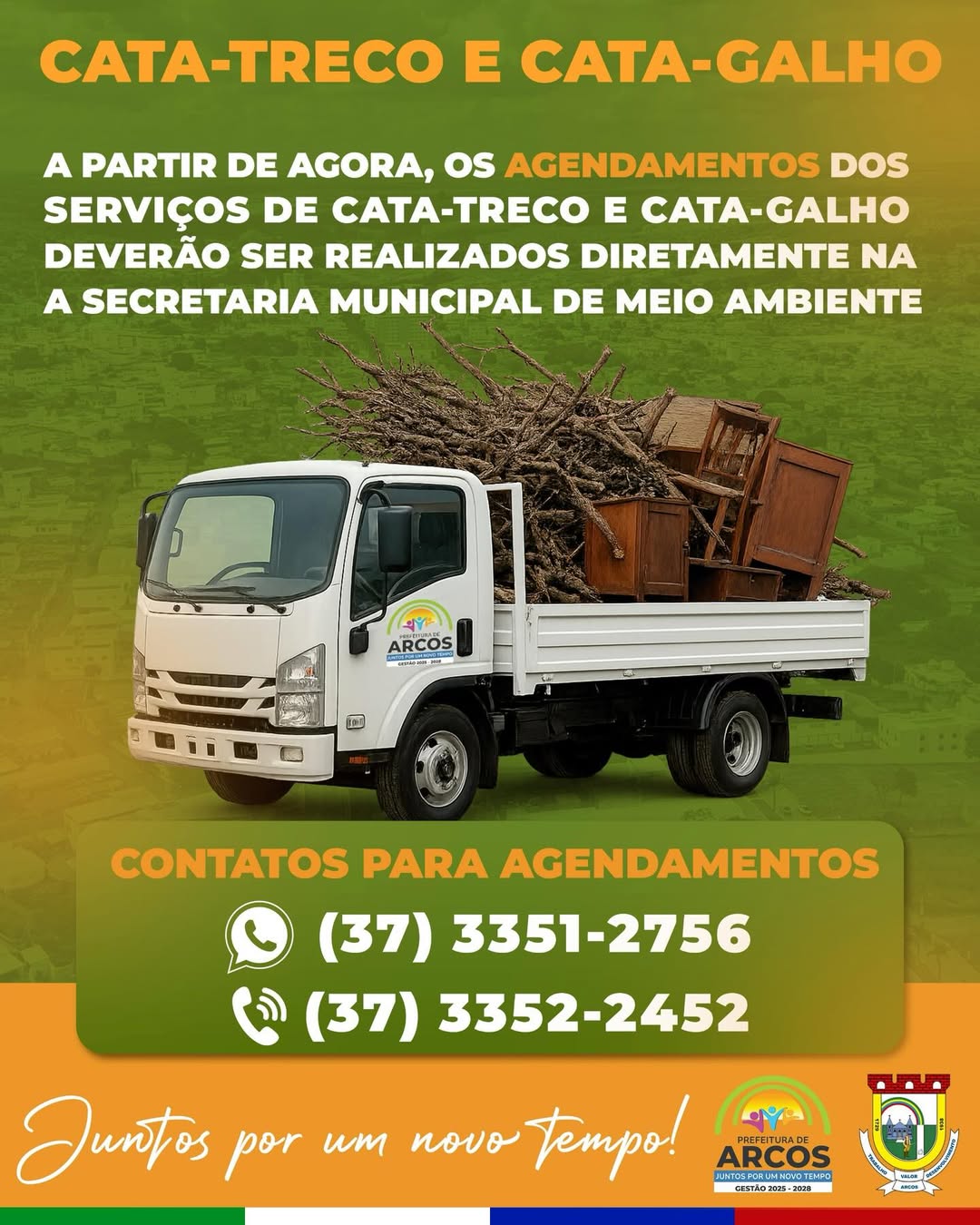 Os agendamentos dos serviços de Cata-Treco e Cata-Galho devem ser realizados diretamente junto à Secretaria Municipal de Meio Ambiente.
